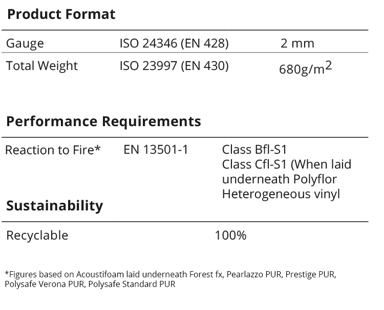 Note: Polyflor homogenous vinyl tiles and both Polyflor & Expona Luxury Vinyl Tiles and Planks as well as the Polyflor ESD ranges should not be used in conjunction with Acoustifoam.