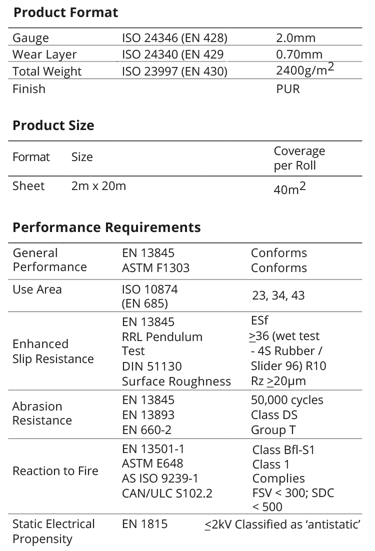 Polysafe Mosaic PUR is a high specification, decorative safety vinyl flooring range combining the assurance of sustainable slip resistance with high durability for years of performance. Ideally suited for heavy traffic areas where there are risks of water spillage and other contaminants in commercial and residential areas such as corridors, receptions, hospital wards, classrooms, shops, and bars & cafes.