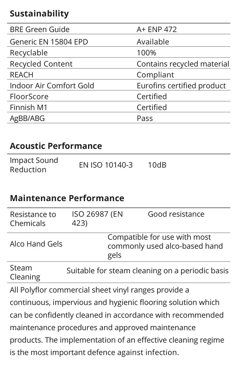 Polyflor's product specific EPDs are verified by IBU (Institut Bauen and Umwelt e.V.) - an independent environmental organization which works closely with construction and environmental authorities in Germany. Product specific EPDs available on www.ibu-epd.com/en/-published-epds
