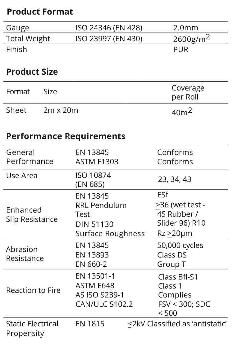 Polysafe Verona PUR is a safety vinyl range combining the assurance of slip resistance with high durability for years of performance. The combination of pastel shades and deeper hues, with a specially engineered emboss and a matt finish, ensures a fresh new range with a distinctive style. The product is carborundum-free, meaning it contains no dark aggregates found within traditional safety flooring.